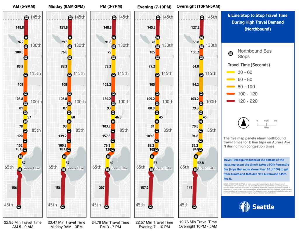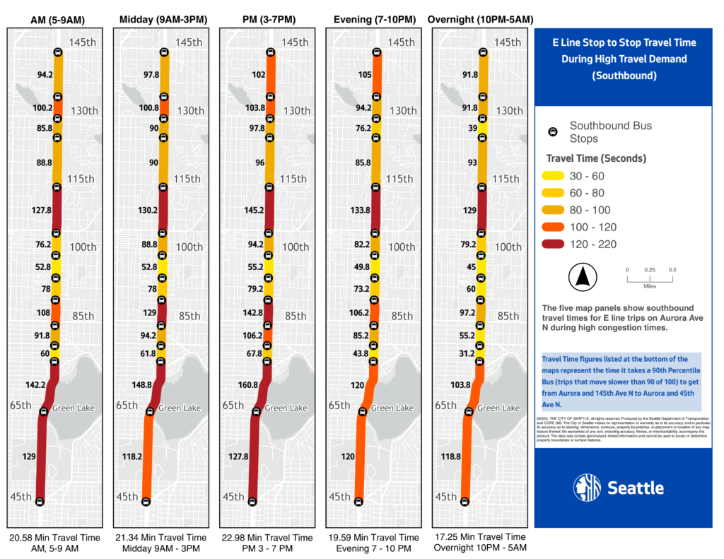 The E line carries about 13,000 passengers per day through North Seattle on Highway 99/Aurora. We made these maps to show the performance of the bus through an important section before parking regulations were altered in parts of the route.