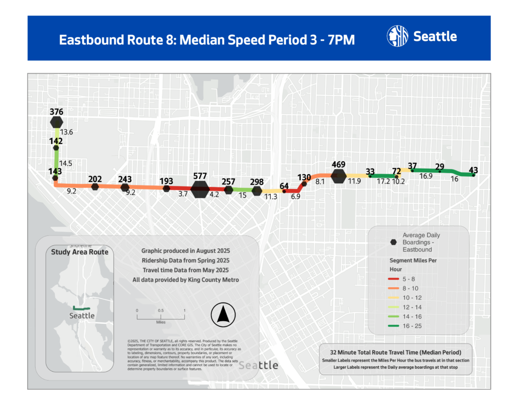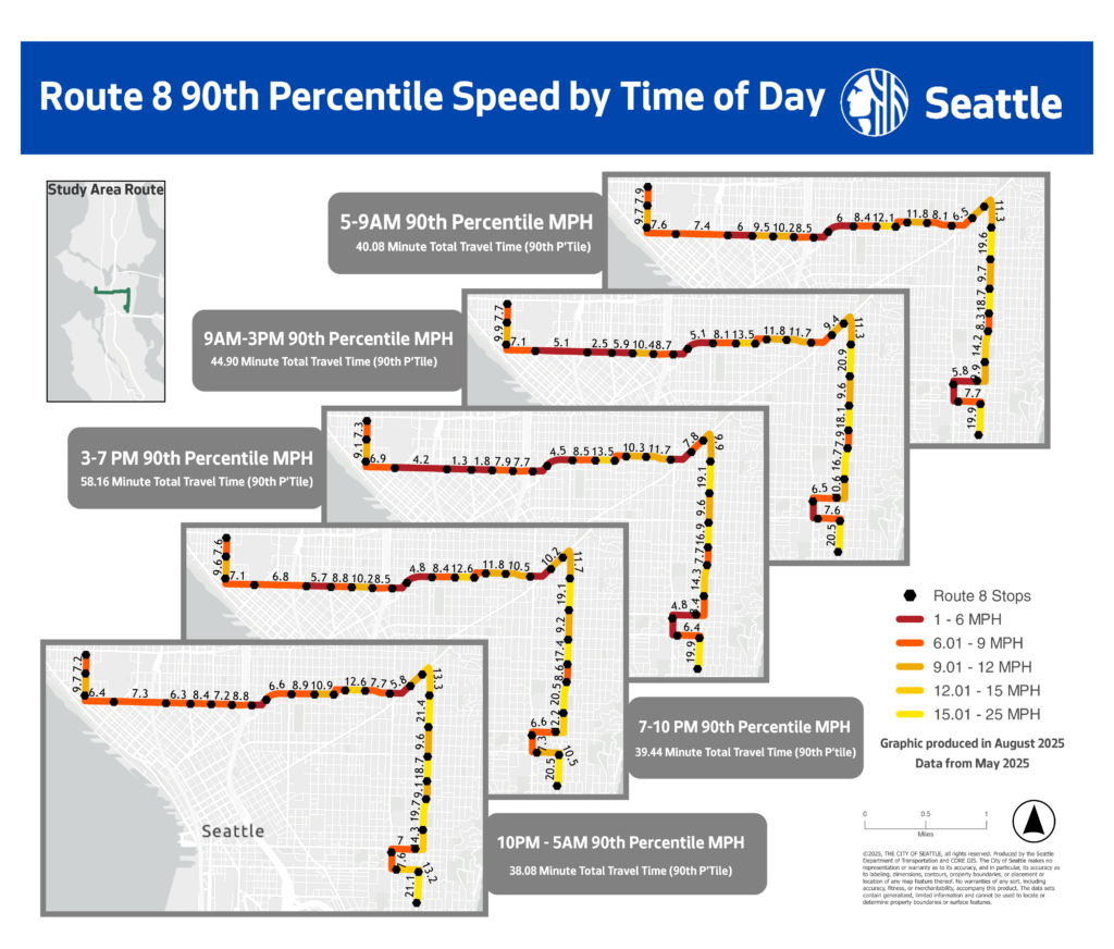 We made these visualizations to describe the behavior of the 8 through its most delayed and ridden sections. Our maps were used by SDOT to help understand exactly where the pain points are.